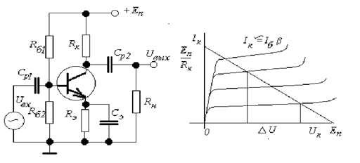 В схеме ОЭ входной сигнал подаётся на базу, а выходной сигнал снимается с коллектора. Схема и выходные характеристики изображены на рис.1Видно, что схема стала очень сложной. Однако главное, что здесь есть – это резистор Rк , который определяет коэффициент усиления по напряжению, и который составляет от единиц кОм до МОм (чем больше этот резистор, тем больше усиление). Все остальные элементы более или менее условны.Прежде всего Rэ необходимо для термостабилизации транзистора. Это осуществляется за счёт обратной связи по постоянному току, которую мы обсудим позже.