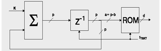 Основним вузлом синтезатора (рисунок 1) є суматор (НС), який працює, як генератор адреси для адресації постійного запам'ятовує пристрою (ПЗП), що містить відліки функції, що синтезується, як правило, тригонометричної.