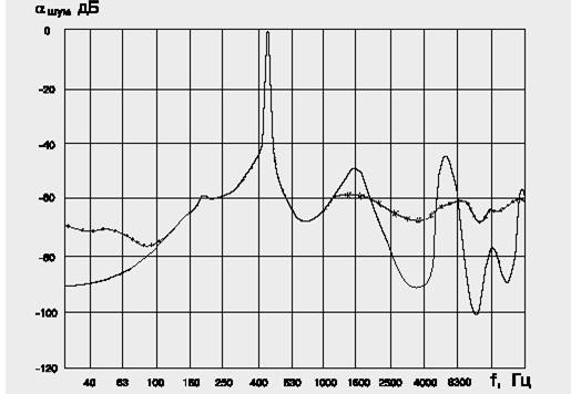 Суцільною лінією показаний спектр ЦСПСЧ без системи шумового формоутворення, хрестиками показаний спектр ЦСПСЧ з системою шумового формоутворення для компенсації помилки округлення НС.