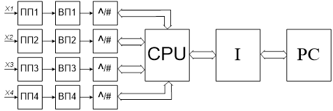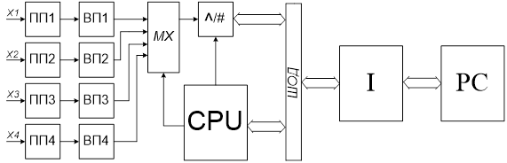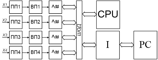 Принцип роботи даного варіанту полягає в наступному. Фізична величина у відповідному вимірювальному каналі перетворюється в уніфікований сигнал за допомогою первинного та вторинного вимірювальних перетворювачів, після чого поступає на вхід АЦП. АЦП працює в режимі постійного перетворення. Кожен вимірювальний канал має свою адресу. Виходи всіх АЦП підключені до шини обміну даними. До шини також підключені мікроконтролер та інтерфейс для зв’язку з ПЕОМ. Якщо необхідно в певний момент часу провести вимірювання фізичної величини у будь-якому вимірювальному каналі, то процесор виставляє на шину адресу відповідного каналу. Після перетворення АЦП виставляє на шину цифровий код, який зчитується процесором.