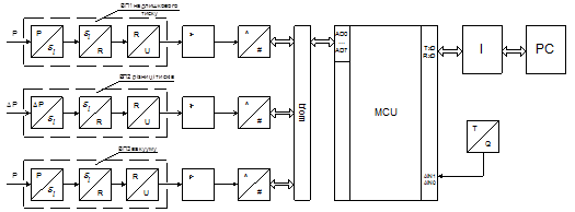 , передаючи таким чином навантаження на тензорезистори, включені в мостове коло. Відносна зміна опорів тензорезисторів викликає розбалансування моста, і на виході датчика ми отримаємо напругу, що залежить від прикладеного тиску. Значення цієї напруги підсилюється підсилювачем і поступає на вхід АЦП, що працює і режимі безперервного перетворення. Мікропроцесор виставляє на шину обміну даними адресу відповідного каналу, в залежності від того, яке значення тиску необхідно виміряти в даний момент часу. За сигналом від мікропроцесора АЦП виставляє на шину код, відповідний значенню тиску, який зчитується мікропроцесором. Для вимірювання температури використовується датчик температури, вихідним інформативним параметром якого є шпаруватість імпульсів. Вихідний сигнал цього датчика поступає на вхід аналогового компаратора, вбудованого в мікропроцесор. Для зв’язку ІВС з ПЕОМ передбачено використання інтерфейсу.