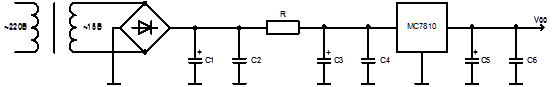 Для забезпечення роботи датчиків необхідно гарантувати стабільне їх живлення. Для цього використаємо схему джерела живлення з використанням лінійного стабілізатора напруги МС7810 зображену на рисунку 3.8.