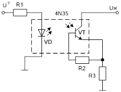Для забезпечення гальванічної розв’язки використаємо оптопару 4N35, схема підключення якої зображена на рисунку 3.10. Принцип роботи оптопари наступний. Коли через світлодіод оптопари протікає струм, він випромінює світло. Відповідно відкривається фототранзистор оптопари і через нього почаняє протікати струм. Фототранзистор включений як емітерний повторювач, відповідним навантаженням якого є резистор R3.