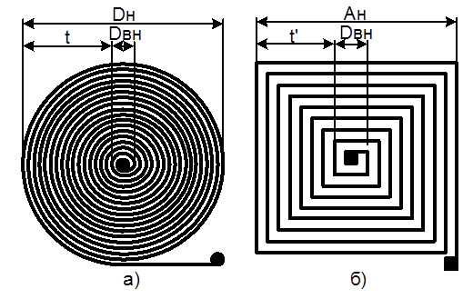 Поэтому тонкопленочные катушки обычно имеют на площади 1 см2 число витков не более 10 и выполняются в виде круглой или квадратной спирали (рисунок 7а,б). Индуктивность таких катушек определяют по формулам: