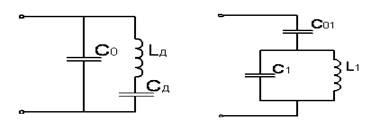 Схема замещения кварцевого резонатора на рисунке 2а используется в расчётах наиболее часто. Её параметр С0 носит название статической ёмкости резонатора, а параметры Сд и Lд называются соответственно динамической ёмкостью и динамической индуктивностью.
