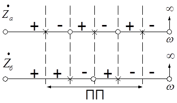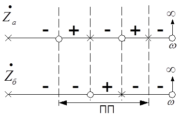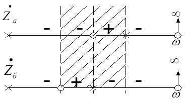 Известно, что в мостовой схеме полоса пропускания находится в области частот, где Za и Zб имеют разные знаки. Включим вместо Za и Zб кварцы, у которых нули и полюсы их сопротивления на характеристических строках смещены относительно друг друга, как показано на рисунке 5.
