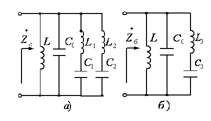 Включим теперь вмсето Za два параллельно соединённых кварца со смещёнными нулями и полюсами, а вместо Zб кварц с параллельно ему включённой ёмкостью. Эквивалентные схемы реактивных двухполюсников, соответствующие такому соединению показаны на рисунках 6а и 6б.