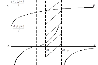 Воспользуемся условиями фильтрации для характеристического затухания. Для этого вычертим графики частотной зависимости реактивных сопротивлений Z1 /j, Z2 /j и определим область, где они имеют разные знаки, кроме того, |Z2 |>|Z1 |. На рисунке 12 эта область заштрихована.