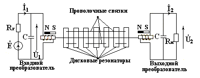 и обмотку преобразователя. Проходя через обмотку, он создает магнитное поле, которое пронизывает ферритовый стержень, вызывая колебания последнего с частотой сигнала генератора. Эти колебания передаются первому дисковому резонатору посредством тонкой проволочной связки. Механическая энергия передается от диска к диску посредством проволочных связок, приваренных по окружности каждого диска. Колебания от последнего диска через проволочную связку возбуждают выходной преобразователь. Механические напряжения, возникающие в выходном преобразователе, вызывают появление переменного магнитного поля, которое в свою очередь индуцирует электрическое напряжение