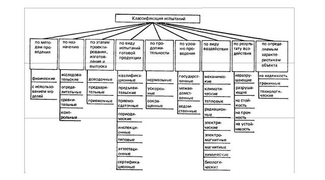 Все испытания РЭСИ классифицируют (рисунок 1) по методам проведения, назначению, этапам проектирования, изготовления и выпуска, виду испытаний готовой продукции, продолжительности, уровню проведения, виду воздействия, определяемым характеристикам объекта.
