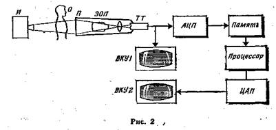 На рис. 2 в качестве примера представлен тракт преобразования изображения при рентгеновском исследовании с помощью ЭВМ. Полученное на флюороскопическом экране П световое изображение усиливается электронно-оптическим преобразователем (ЭОП) и поступает через оптическую систему на вход телевизионной трубки ТТ, превращаясь в последовательность электрических сигналов. С помощью АЦП производится дискретизация и квантование, а далее запись в оперативную цифровую память — ОЗУ и обработка сигналов изображения по заданным программам в ЭВМ. Преобразованное изображение вновь превращается в аналоговую форму с помощью цифро-аналогового преобразователя ЦАП и выводится на экран видеоконтрольного устройства ВКУ полутонового дисплея. Для сравнения на другом ВКУ может регистрироваться первичное изображение непосредственно с телевизионной трубки ТТ.