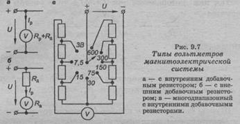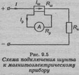 Обмотку рамки измерительного механизма рассчитывают на токи до 100 мА, если прибор используют как амперметр, и до 10 мА, если как вольтметр. Большие токи вызвали бы увеличение сечения проводов обмотки рамки (обычно диаметр проводов не превышает 0,2 мм), а следовательно, массы и момента инерции подвижной части прибора. Пределы измерения по току в магнитоэлектрических приборах расширяют с помощью шунтов, а по напряжению — с помощью добавочных резисторов.