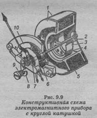 Электромагнитные приборы действуют по принципу перемещения подвижного сердечника из ферромагнитного материала под влиянием магнитного поля неподвижной катушки. Сердечник укреплен на одной оси со стрелкой указателя. Распространены две конструкции: приборы с плоской катушкой и приборы с круглой катушкой .