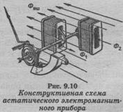 Встречаются конструкции, в которых устанавливают две неподвижные катушки с самостоятельными сердечниками, насаженными на одну ось, так называемые астатические приборы (рис. 9ДО). Здесь обе обмотки включены последовательно, но так, что их потоки Фх и Ф2 направлены встречно, а моменты, создаваемые этими потоками и действующие на подвижную часть прибора, согласны. При такой конструкции внешний магнитный поток Фвш в одной катушке усиливает, а в другой уменьшает вращающий момент прибора на равные значения. Этим исключается влияние внешнего магнитного поля.