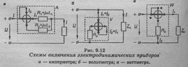 В зависимости от способа взаимного включения катушек электродинамический прибор может быть использован как амперметр, вольтметр, ваттметр или фазометр.