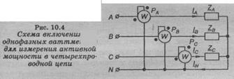 При несимметричной нагрузке активную мощность измеряют тремя ваттметрами, каждый из которых измеряет мощность одной фазы — фазную мощность. Для этого ваттметры включают так, чтобы через последовательные обмотки замыкались фазные токи, а на параллельные обмотки были поданы фазные напряжения. Тогда фазные мощности
