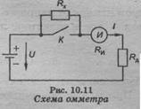 Для непосредственного измерения сопротивлений применяют омметры — приборы, у которых шкала проградуирована в омах. Обычно омметры — это приборы, объединяющие в одном корпусе миллиамперметр магнитоэлектрической системы (или магнитоэлектрический логометр), источник питания (сухой гальванический элемент) и ограничивающий ток добавочный резистор RД (рис. 10.11). При замкнутом ключе К регулируют напряжение U источника питания так, чтобы стрелку прибора установить на нулевую отметку шкалы прибора, которая находится в правом краю шкалы, при этом ток в приборе — I0 . При размыкании ключа К ток в приборе