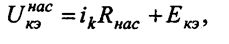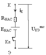 Чтобы было удобно анализировать транзистор в области насыщения, заменим его следующей эквивалентной схемой. Имеется идеальный ключ, изображенный на рис.2, на котором падает небольшое напряжение UКЭ нас . Напряжение на насыщенном ключе в эквивалентной схеме определяется следующим образом: