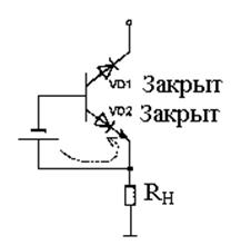 Что такое состояние насыщения лучше всего пояснять, представив транзистор в виде двух диодов (рис.1). В ненасыщенном состоянии диод VD1 закрыт. В состояние насыщения транзистор можно перевести, «подняв» потенциал базы выше потенциала коллектора с помощью, например, дополнительного источника напряжения UДОП .В этом случае произойдет отпирание диода VD2 и транзистор перейдет в состояние насыщения.