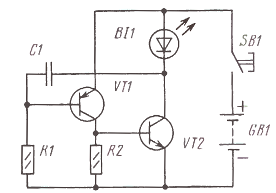 Схема самого простого варианта пульта управления показана на рис. 1.1. Это — генератор импульсов на транзисторах разной структуры, нагрузкой которого служит излучающий диод ИК-диапазона. Генератор питают от трех-четырех гальванических элементов, команду подают кратковременным нажатием на кнопку SB1.