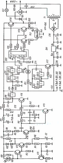 Схема выключателя показана на рис.1.2. Приемник ИК импульсов собран по схеме, подобной применяемой в блоках управления телевизоров "Рубин" и "Темп". На транзисторах VT1-VT4 собран усилитель импульсов, в которые преобразует принятое ИК-излучение фотодиод VD1, чувствительный к ИК лучам. Далее принятый сигнал проходит через активный фильтр с двойным Т-мостом, собранный на транзисторе VT5. Фильтр устраняет помехи от осветительных ламп, излучение которых захватывает ИК-область спектра и промодулировано удвоенной частотой сети переменного тока. Возможное иногда самовозбуждение этого фильтра устраняют заменой транзистора другим, с меньшим значением h21э .