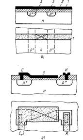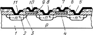 Освоение технологии микросхем на Д-МДП-транзисторах с использованием эпитаксиальных структур позволяет, кроме того, формировать на одной и той же подложке биполярные п-р-п-транзисторы и изолированные от них Д-МДП-транзисторы (рис.8), что имеет исключительное значение для производства как аналоговых (например, операционных усилителей), так и логических микросхем.