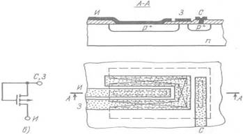 Рис.1 Конструкция (а) и электрическая схема (б) нагрузочного р-канального МДП-транзистора