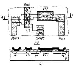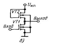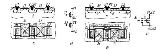 Для повышения степени интеграции в микросхемах, требующих последовательного и параллельного соединения транзисторов, области истоков или стоков МДП-транзисторов могут быть объединены (рис.3). На рис.4 приведена конструкция инвертора, в которой диффузионная область стока активного VT1 и истока нагрузочного VT2 МДП-транзисторов объединены.