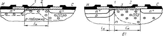 Рис.7. Структура обычного n-канального МДП-транзистора (а) и диффузионного n-канального Д-МДП-транзистора (б): / - область канала; 2 - область дрейфа электронов.
