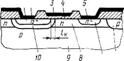 Рис.8. Структура планарно-эпитаксиального Д-МДП-транзистора: 1,7-диффузионныеобласти истока и стока; 2,5-шины алюминиевой металлизации; 3 - затвор; 4 - подзатворный тонкий окисел; 6 - изолирующая область; 8 - n-эпитаксиальный слой, 9 - подложка; 10 - область получаемая методом двойной диффузии для формирования канала транзистора.