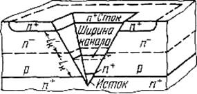 Пирамидальная ямка вытравливается на такую глубину, чтобы она пересекла ионно-легированный слой n+-типа и эпитаксиальный слаболегированный р-слой, диффузионно-легированный n–-слой, достигнув вершиной высоколегированной подложки n+ - типа. Сечение р-слоя служит основой для формирования канала. Этот слой имеет глубину менее 1 мкм, его сечение плоскостями V-образного углубления определяет длину V-МДП-транзистора. Ширина канала в V-МДП-транзисторе получается большой, так как этот канал расположен по всему периметру V-образного углубления. Поскольку ширина канала определяет максимальный ток транзистора и его усиление, постольку V-МДП-транзисторы можно непосредственно сопрягать с системами, требующими больших управляющих токов, например со схемами, содержащими большое количество ТТЛ-нагрузок, светодиодными индикаторами и даже небольшими электродвигателями.