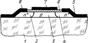 Рис.11. Структура МДП-транзистора на диэлектрической (сапфир) подложке: / - подложка; 2, 4 - исток и сток; 3 - эпитак-сиальная р-область; 5, 8-шины металлизации; 6 - подзатворный тонкий диэлектрик; 7-затвор.