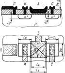 Области истока и стока одного типа электропроводности формируют на некотором расстоянии /к друг от друга локальной диффузией или ионным легированием (рис.1). Они изолированы друг от друга р-п переходами. Между ними поверх слоя диэлектрика расположен затвор, выполненный из проводящего материала.