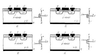 Рис.2. Структуры и условные обозначения МДП-транзисторов: со встроенными п-(а) и р-каналом (б), с индуцированными л-(в) и р-каналом (г); И - исток; 3 - затвор; С - сток; П – подложка.