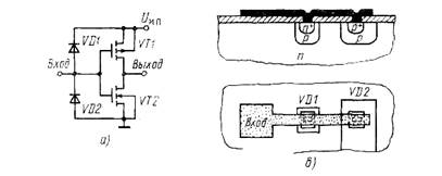 Охранные диоды предусматриваются во входных цепях МДП-микросхем и предназначены для предотвращения пробоя подзатворного диэлектрика под действием зарядов статического электричества, накапливающегося на одежде и руках операторов, на инструменте монтажника и технологической оснастке. Заряд этот может быть любого знака. Диоды VD1 и VD2 (см. рис 3), подключенные к входной шине инвертора, позволяют положительному заряду стекать через диод VD1, а отрицательному - через диод VD2. При проектировании охранных диодов необходимо обеспечить высокое напряжение прибоя р-п переходов диодов (более 2Uи. п) и малые паразитные емкости. Первое требование выполняется использованием в качестве одной из областей диода VD1 низколегированной подложки, а для диода VD2 - низколегированной р-области. Второе требование выполняют минимизацией площади р-п переходов.