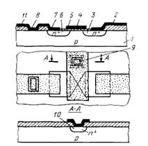 Рис.4. Конструкция n-канального транзистора с охранным диодом: l-подложка г-типа; 2, 7-алюминиевые шины; 3, 6-области истока и стока; 4-алюминиевый затвор; 5 - подзатворный окисел; 8 - контакт истока с подложкой; 9 - охранный диод; 10 - катод защитного диода; 11-толстый окисел.