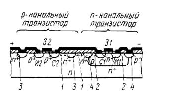 Паразитный р-канал может образоваться между р+-областью истока р-канального транзистора и p-областью, в которой расположен n-канальный транзистор, при отрицательном потенциале на алюминиевом проводнике. Вероятность появления этого канала тем выше, чем ниже уровень легирования n-подложки. Охранная кольцевая область n+-типа, соединенная с точкой схемы, имеющей самый высокий потенциал (+Uи. п), предотвращает появление сквозного паразитного канала на этом участке схемы.