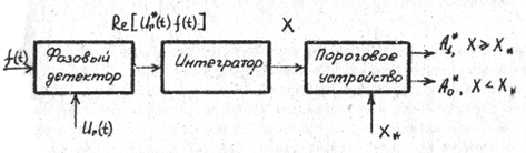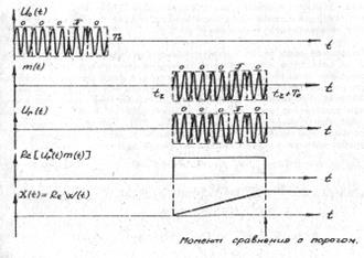 Напряжение на выходе интегратора в течение длительности сигнала увеличивается: идёт процесс накопления энергии сигнала. В конце длительности сигнала, когда напряжение на выходе коррелятора (сочетание перемножителя и интегратора) достигает максимального уровня, должно осуществляться его сравнение с порогом и приниматься решение о наличии или отсутствии сигнала. Следует заметить, что управление порогом Х* при изменении энергии сигнала Эс и спектральной плотности помехи Nо осуществляется так, что при соответствующих изменениях условных вероятностей D и F обеспечивается их максимальная взвешенная ревность D - l0 F, а следовательно минимальный средний риск R.