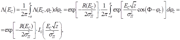 Описанная выше схема корреляционного обнаружителя одиночного сигнала с полностью известными параметрами имеет лишь теоретическое значение. В действительности амплитуда и фаза принятого сигнала априорно неизвестны. В связи с этим найдем усредненное по начальной фазе отношение правдоподобия, учитывая при этом, что начальная фаза равномерно распределена на интервале от - π до π радиан. Для этого вначале величину Q(Ec, φc), монотонно связанную с отношением правдоподобия, представим в виде, отражающем явную функциональную связь с начальной фазой принятого сигнала: