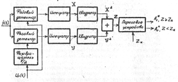 Роль скалярных перемножителей в каналах выполняют фазовые детекторы. Роль интеграторов могут выполнять апериодические RC - цепочки, постоянная времени которых Тф = RC много больше длительности сигнала (Тф >> Т0). Роль квадраторов могут выполнять двухполупериодные выпрямители.