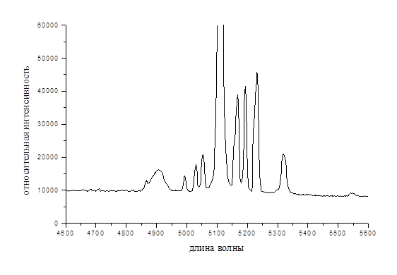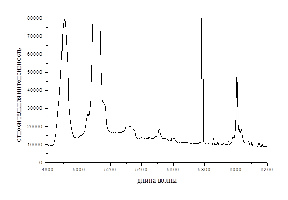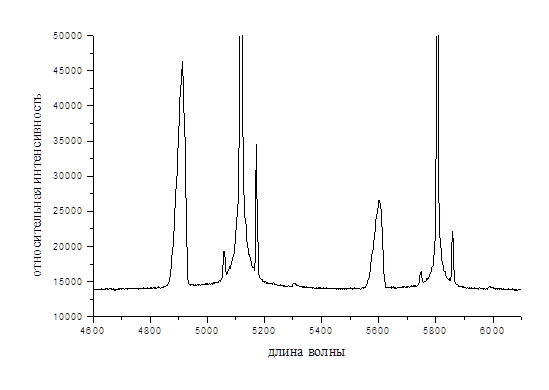 Рисунок 1 . Спектр излучения лазера на парах меди в спектральном интервале, интересном для изучения КР.