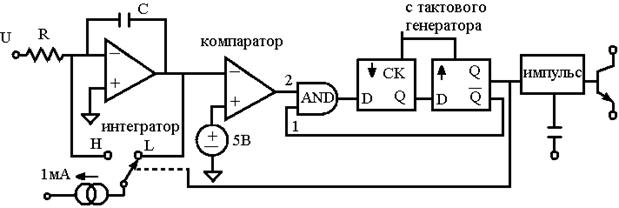 В этой микросхеме входное аналоговое напряжение преобразуется в выходную импульсную последовательность, частота которой пропорциональна входному напряжению. Это осуществляется электрической схемой, приведенной на рис.2.