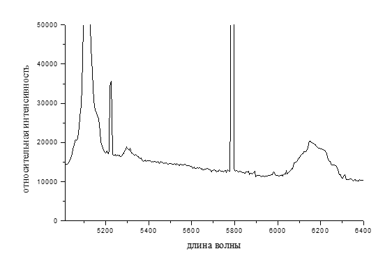 Во-вторых, в спектре излучения медного лазера присутствуют разрядные линии. Их хорошо видно на рисунке 1, который был снят в отсутствие кюветы с жидкостью. Эти линии, при использовании лазера в других целях (например, в медицине), не создают помех в работе вследствие своей относительно малой интенсивности. При наблюдении же спектров комбинационного рассеяния интенсивность этих линий оказывается больше интенсивности сигнала КР. Так же они закрывают собой значительную часть спектральной картины и, в частности, места возможного обнаружения линий КР.