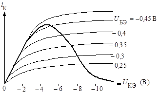 На рисунке 8.18 приведены выходные характеристики одного из транзисторов p- n- p типа. Если напряжение на базе поддерживается постоянным, например U БЭ = – 0,45 В, то при увеличении напряжения на коллекторе ток коллектора только возрастает и никакого падающего участка на характеристике нет.