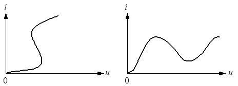 Возможны два типа вольт-амперных характеристик с падающими участками. Первый из них типа S имеет однозначную зависимостьu = f (i ), что иллюстрируется рисунком 8.19 а (отрицательное сопротивление S -типа, управляемое током). Второй, типа N (отрицательное сопротивление, управляемое напряжением), наоборот, однозначную зависимость i = f (u ), что показано на рисунке 8.19, б (туннельный диод, диод Ганна, тетрод с динатронным эффектом).