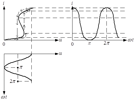 На рисунке 8.20 показан случай, когда к параллельному контуру подключен элемент с характеристикой типа S . Здесь изменяется напряжение по гармоническому закону и не удается использовать падающий участок. Характерным является то, что ток изменяется в фазе с изменением напряжения, в то время как при работе на падающем участке ток должен изменяться в противофазе с изменением напряжения.