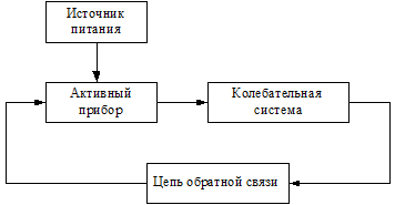 Основными элементами автогенератора, в общем случае, являются источник энергии (источник питания), пассивные цепи, в которых возбуждаются и поддерживаются незатухающие колебания с заданными параметрами (колебательная система) и активный прибор, преобразующий энергию источника питания в энергию генерируемых колебаний (рис. 8.21).