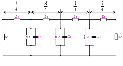- длина волны в линии, соответствующая средней частоте полосы пропускания ППФ; с двойными шлейфами и четвертьволновыми соединительными линиями; на диэлектрических резонаторах.