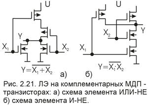 На основе КМДП могут быть построены элементы ИЛИ-НЕ положительной логики при параллельном включении транзисторов n-типа и последовательном включении транзисторов р-типа и элементы ИЛИ-НЕ отрицательной логики при параллельном включении транзисторов р-типа и последовательном включении транзисторов n-типа.