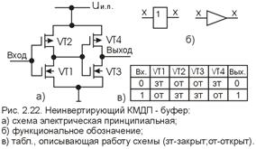 Неинвертирующий КМДП-буфер, а также логические схемы И и ИЛИ получаются в результате подключения инвертора к выходу соответствующего инвертирующего элемента. Реализованные таким образом неинвертирующий буфер и логический элемент И показаны на рис. 2, в и рис. 3, г соответственно.